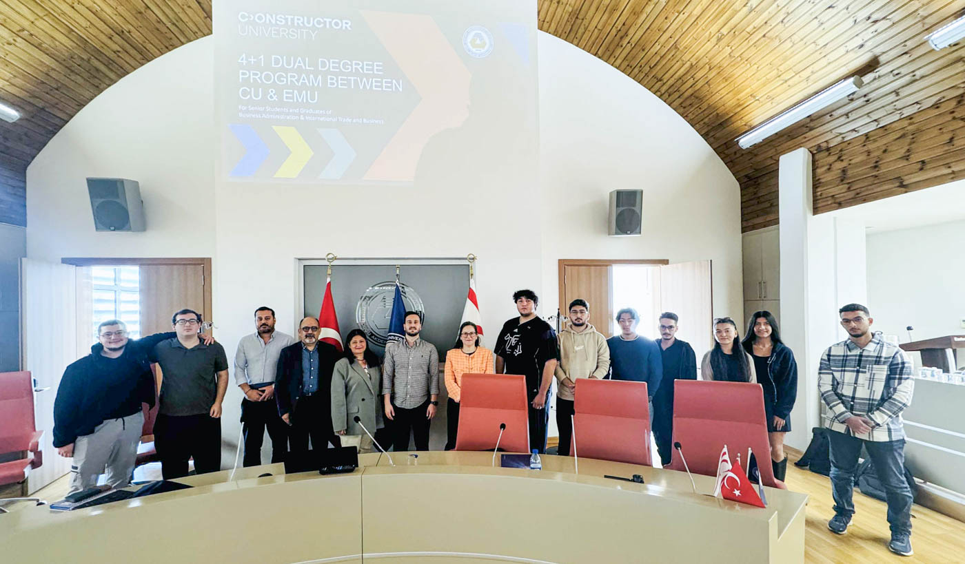 During the meeting, students were introduced to the “4+1 Dual Degree Program” offered as part of the ongoing collaboration between EMU and Constructor University. The program enables graduates of the Business Administration and International Trade and Business programs under EMU Faculty of Business and Economics to complete an additional year of study at Constructor University in Germany and earn an International Business degree from Constructor University. Students’ questions were answered, and detailed information was provided on tuition fees, accommodation options, and living conditions in Germany.