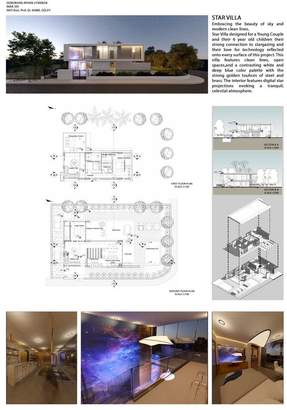 The “Star Villa” residential interior design project by Dorukhan Ayhan, developed under the supervision of Assist. Prof. Dr. Kamil Güley, was awarded Platinum in the “Best Student Building or Facility Project” category, with the jury highlighting its original spatial design and contemporary interior architecture approach.